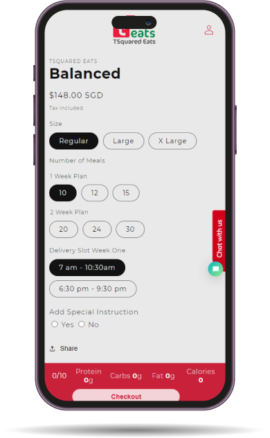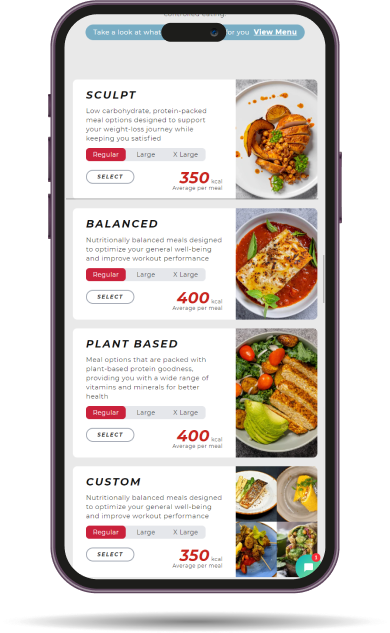 Once you have seen our menu and wish to order, click here, select your meal plan (Sculpt, Balanced, Plant-based or Custom), Meal Size (Regular/ Large/ XL) and the number of meals you want to order.